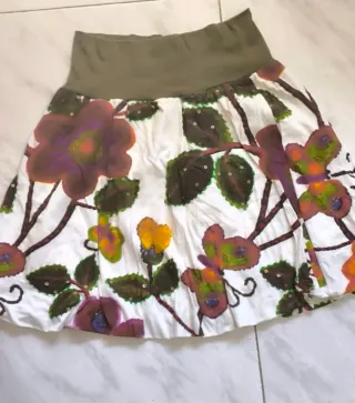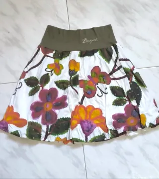 Falda de la marca Desigual con un diseño único y colorido. - Estampado con motivos florales, mariposas y corazones. - Cintura con cordón ajustable. - Bajo asimétrico con detalles. - Parches y bordados decorativos.