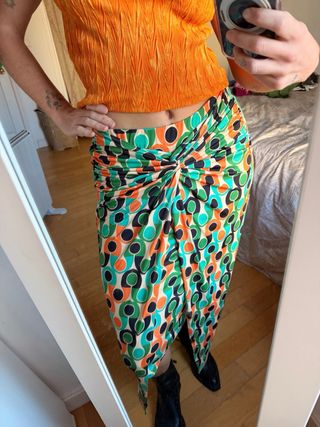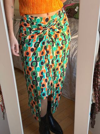 Falda larga con estampado geométrico y detalle anudado en la cintura. Falda M Stradivarius Estilo Sesentero desigual. - Diseño con abertura delantera. - Tejido fluido y ligero. - Estampado llamativo con círculos en verde, naranja y negro.