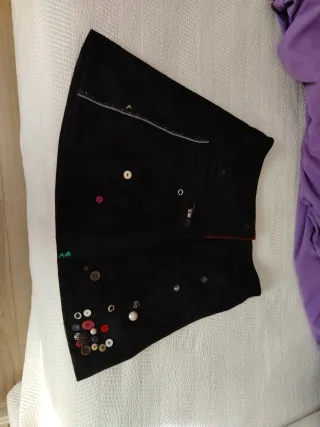 Falda de la marca Desigual con un diseño único. - Tejido principal negro. - Detalle frontal con estampado floral. - Adornos de botones de colores. - Cremallera plateada.