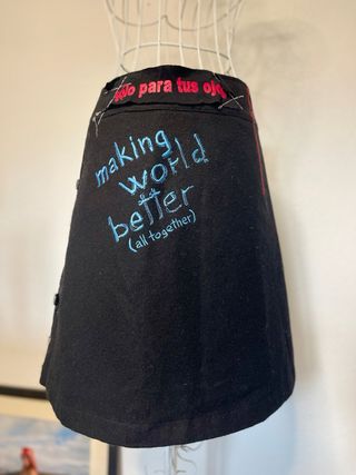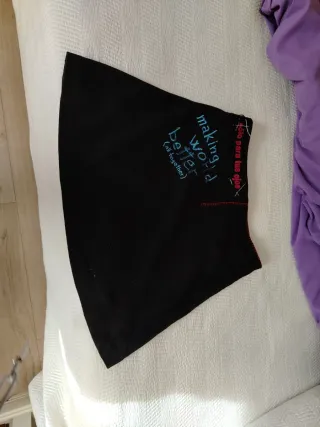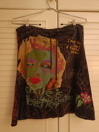 Falda con un diseño artístico y vibrante, perfecta para añadir un toque único a tu estilo. - Estampado frontal de rostro con detalles bordados. - Frase smile is better en verde. - Bordado de flor en el lateral. - Cordón ajustable en la cintura. - Está usada pero en perfecto estado.