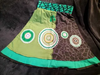 Falda de estilo vintage con un diseño llamativo y original. - Estampado de círculos concéntricos en tonos verdes y marrones. - Detalle de parche hexagonal en la parte delantera. - Adornos circulares con bordados de colores. - Cordón ajustable en la cintura.