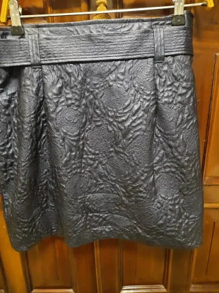 Minifalda slim con relieve de flores. Talla L. Cierre frontal con corchetes, dos bolsillos laterales, cinturón .Color azul noche. Tejido troquelado de poliuretano y forro fe poliéster con mensajes. Largo 47cm, cintura 82cm. Nueva. Nunca usada.