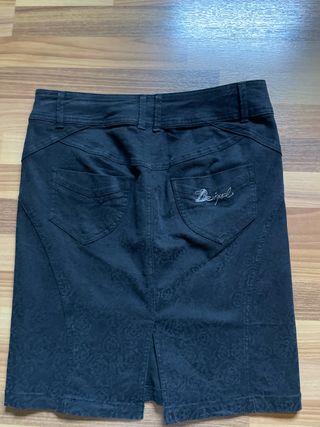 Elegante falda negra de la marca Desigual. Un básico con un toque especial.Talla: 42 ( fotos con las medidas ) - Diseño con estampado floral sutil. - Dos bolsillos traseros. - Cintura con trabillas para cinturón. - Abertura trasera para facilitar el movimiento.