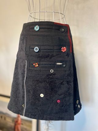 Falda de la marca Desigual con un diseño único. - Detalle de cremallera. - Adornada con varios botones. - Costuras decorativas en rojo.