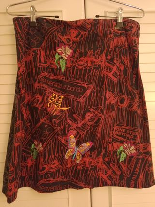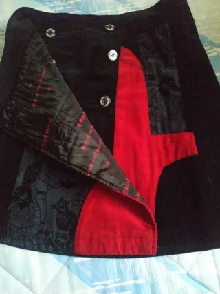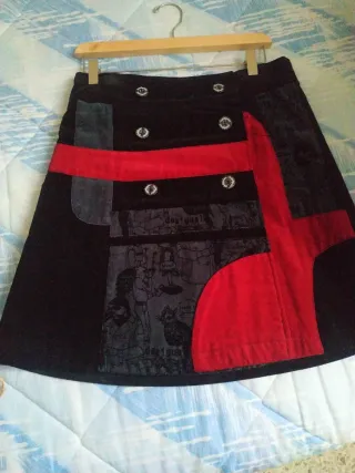 Falda de la marca Desigual con un diseño original. - Combinación de colores negro y rojo. - Detalle de parches y estampado gráfico. - Cierre con botones decorativos.