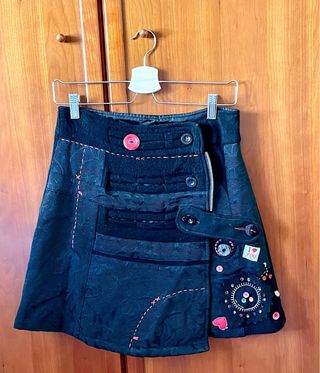 Preciosa falda de la marca Desigual. Es de color negro y tiene un diseño único con detalles bordados. - Está confeccionada con una tela suave y cómoda. - Es una prenda ideal para cualquier ocasión.