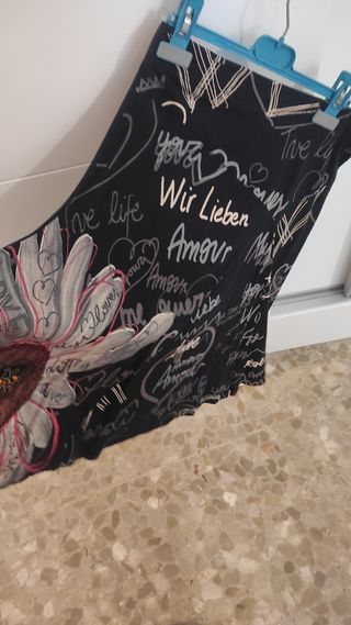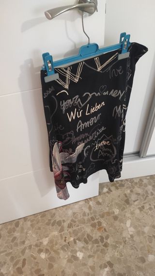 Falda corta de color negro con un diseño llamativo (pasa rodillas) - Estampado frontal con texto y corazón. - Diseño asimétrico en el bajo. Se vende porque hace años que no la uso. buen estado para segundo uso. Recogida en Bormujos o envío por wallapop