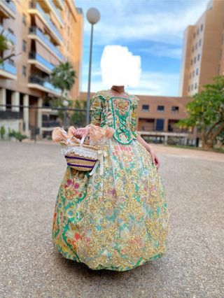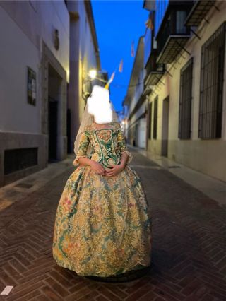 Se vende vestido de fallera de niña. Confeccionado en tela de alta calidad, en tonos verde, dorado y detalles florales. Está en perfecto estado, usado solo en un par de ocasión. ✔️ Medidas: 80 cm falda 37 cm chaquetilla para niña de 1,20 m a 1,40 m lo mejor ee probar ✔️ Características: ✅ Diseño tradicional y elegante. ✅ Incluye enagua. ✅ Detalles de encaje y pasamanería de gran calidad. ✅ Muy cómodo y ligero para llevar. ✔️ Entrega: Se puede probar sin compromiso. Entrega en mano o posibilidad de envío (consultar condiciones).