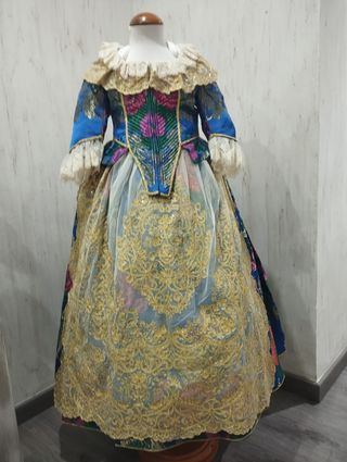 Traje de fallera de estilo siglo XVIII hecho a mano, ideal para niñas de 4 a 6 años. Incluye 3 pares de zapatos. Necesita tintorería. La falda incluye tirantes para sujeción. Medidas aproximadas: -Largo falda: 67 cm -Cintura: 60 cm -Hombro a hombro: 26 cm -Largo cuerpo 34 cm -Circunferencia bíceos: 27 cm -Largo manga: 39 cm con puntilla incluida -3 pares de zapatos: talla 28 -Enagua incluida.