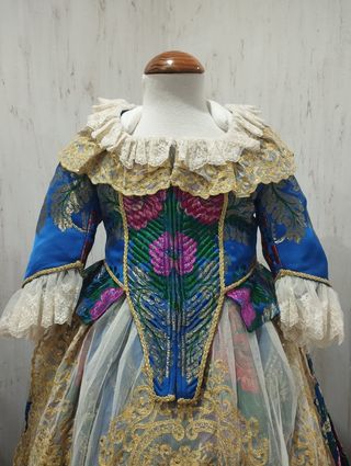Traje de fallera para niña de 9 años, con un diseño floral y detalles dorados. - Tejido brocado con motivos florales y lazos. - Mangas abullonadas con encaje. - Cuerpo con pechera y falda a juego. Está para llevarlo a la tintorería.