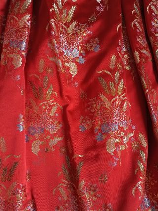 vestido de fallera compuesto de falda roja con detalles florales en colores y un corpiño dorado con manteleta. Si necesitas medidas, no dudes en pedirmelas