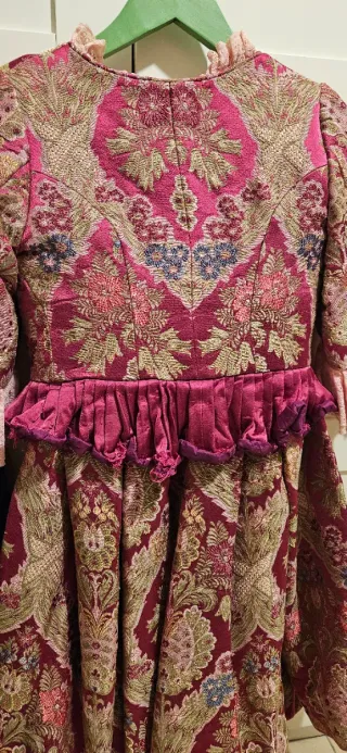 Traje tradicional de fallera, una pieza única con un diseño elaborado. - Tejido brocado con motivos florales y detalles dorados. - Cuerpo entallado con ballenas. - Mangas largas con volantes. - Escote cuadrado adornado con encaje. - Falda amplia con gran caída.