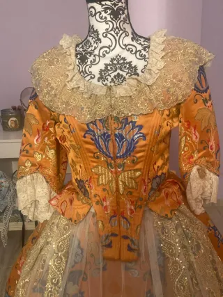 Traje de fallera adulta con un diseño espectacular. - Tejido principal en tonos dorados y naranjas. - Detalle de encaje dorado en la falda. - Cuello y mangas adornados con volantes de encaje.