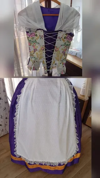 Traje de fallera siglo XVIII completo, (talla 40 mas o menos) en perfecto estado, dos pares de zapatos forrados (talla 40/41) con manteletas. Medidas: Faldar: Contorno cintura 75 cm Largo 107 cm Corpiño: Sisa a sisa 47 cm Largo trasero desde el hombro 45 cm, desde el centro 40 Largo delantero desde el hombro 47 cm, desde el centro 39 cm Mangas: largo 31 cm, ancho 15 cm. Se puede ver sin compromiso.