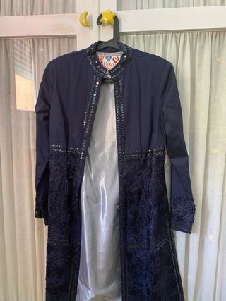 Elegante abrigo largo, ideal para eventos especiales. Su diseño combina un tejido liso con detalles de encaje y lentejuelas. - Cuello redondo. - Cierre frontal. - Mangas largas. - Adornos de lentejuelas y encaje. Tiene falda a juego