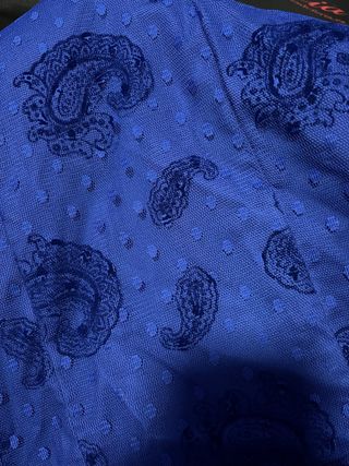Traje de flamenca en azul intenso, entallado y muy favorecedor. Mangas largas abullonadas, escote discreto y falda con volantes que aporta movimiento y elegancia. Tela con base de tul. Motivos en terciopelo flocado con tipo cachemir. Ligero con algo de elasticidad. Precio negociable