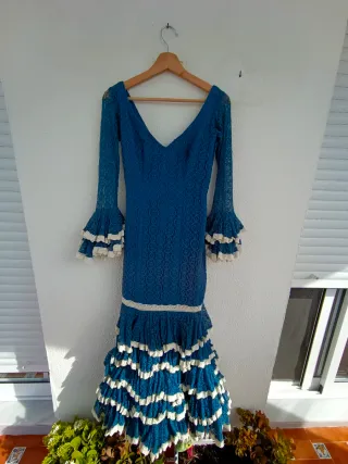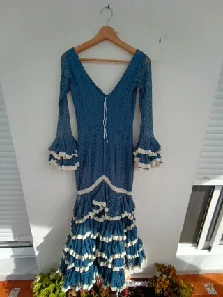 Precioso traje de flamenca. Es un vestido azul de talle alto con falda de volantes. Aconsejaría entrega en mano. - Diseño elegante y favorecedor. - Manga tres cuartos. - Tejido ligero y cómodo. - Perfecto estado. Medidas: 80 de pecho 80 cadera 26 mangas sin volantes, 42.5 cn volantes 140 largo