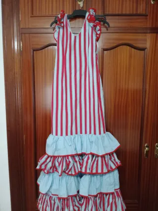 Traje de flamenca con un diseño de rayas verticales azules y detalles en rojo. Presenta volantes en las mangas y en la falda. - Diseño a rayas. - Volantes en mangas y falda. - Adornos en color rojo.
