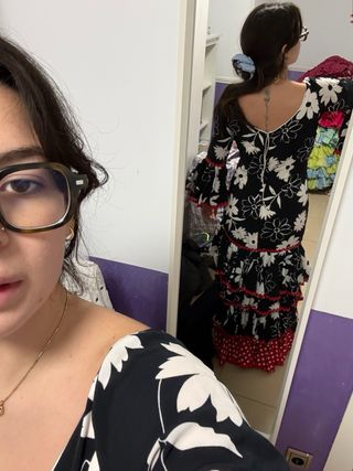 Vestido de flamenca con un diseño llamativo. - Mangas acampanadas con volantes. - Falda con múltiples volantes. - Estampado floral blanco sobre fondo negro. - Detalles de lunares rojos. Hecho a mano Tiene para sacar