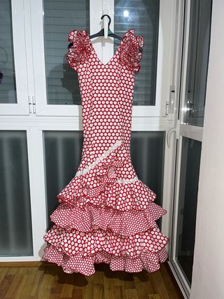 Precioso traje de flamenca para niña, en tonos rojos y blancos, con volantes en manga. Ideal para cualquier evento especial. Es una prenda vintage, con un diseño encantador. - Diseño de volantes en la falda y mangas. - Cintura elástica para mayor comodidad. - Tejido ligero y fluido. - Talla para niña de 4-5 años
