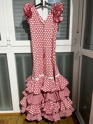 Precioso traje de flamenca/gitana, de un color coral muy favorecedor con detalles de ribete en blanco. -La talla es M/38, pero el tejido permite sacarle algo más de tela para que sea talla 40 o meterle un poco y que valga para S/36. - Falda de vuelo con varias capas de volantes. - Manga sisa.