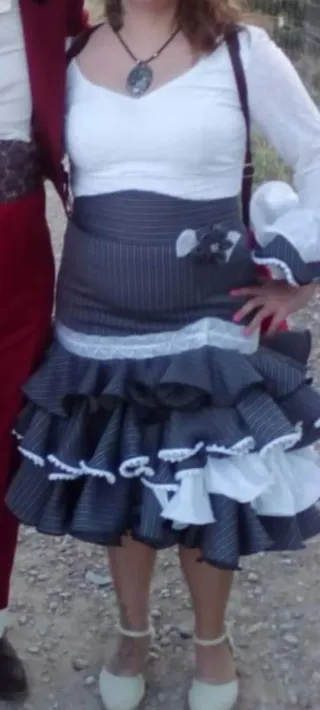 Preciosa falda flamenca artesanal. Ideal para lucir en cualquier evento. Equivale a una talla 44. Sólo una puesta - Diseño elegante y sofisticado. - Cuatro volantes amplios. - Combinación de blanco y gris