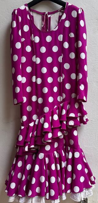 Vestido de flamenca con un diseño de lunares. - Mangas largas con volantes. - Volantes en la falda. - Adorno de encaje en la cintura y mangas. -tiene bolsillo -tiene para sacar -marca olivares del corte ingles