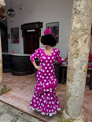 Preciosa falda de flamenca de color buganvilla con lunare blancos una prenda elegante y vistosa, ideal para cualquier evento, mejora con un buen planchado - Falda larga con vuelo. - Diseño de lunares. - Perfecta para lucir en una fiesta flamenca. - Talla 38 se puede ampliar a talla 40 e incluso 42 - Largo 155 cm se le puede sacar - Es de la tienda cordobesa La Peineta Se regala camisa y fajín incluido