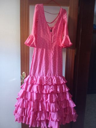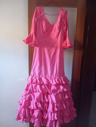 Precioso vestido de flamenca, ideal para cualquier evento. Es de color rosa con lunares blancos y tiene varias volantes en la falda. - Perfecto estado. - Talla única. - Incluye un vestido.