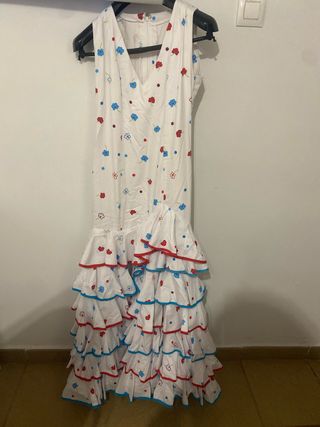 Precioso traje de flamenca para niña de 10 años. Ideal para cualquier evento. - Elegante diseño en blanco y azul. - Perfecto estado de conservación. - Falda con volantes.