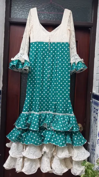 Traje de flamenca con un diseño de lunares blancos sobre fondo verde azulado. Presenta volantes en las mangas y en la falda. - Mangas largas con volantes. - Falda con múltiples volantes escalonados. - Adorno de encaje en los volantes.