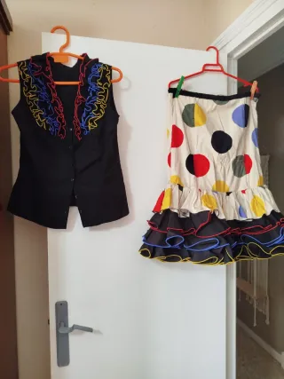 Precioso traje de flamenca dos piezas Consta de una falda y una camisa. La falda es de color blanco con lunares en varios colores y tiene varias volantes. La camisa es negra y tiene unos pequeños volantes en el cuello. El conjunto está en buen estado Talla 38/ 40