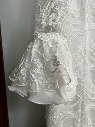 Elegante vestido de gitana en color blanco, con un diseño de encaje y volantes. - Mangas acampanadas con volantes. - Cuerpo de encaje con detalles. - Falda con múltiples volantes escalonados. - Usado en dos ocasiones