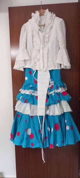 Precioso traje de flamenca compuesto por una falda y una chaquetilla. La falda es de color turquesa con lunares blancos y rojos, y tiene varias volantes. La chaquetilla es blanca, de encaje, con mangas acampanadas y un bonito cuello. Está en muy buen estado. - Incluye una chaquetilla y una falda. - Ideal para cualquier evento flamenco.