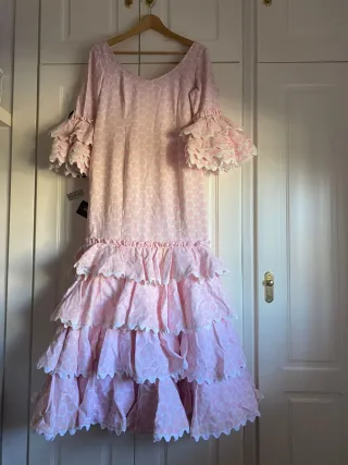 Precioso traje de flamenca, en perfecto estado, muy bien cuidado. - Diseño de lunares rosa y blanco. - Falda con volantes estilo canastero. - Manga larga con volantes. - Talla 38 pero tiene para meterle y para sacarle.