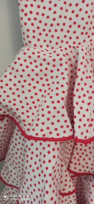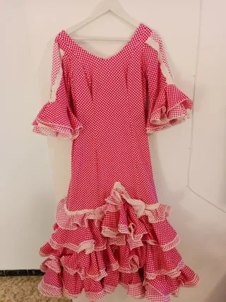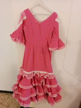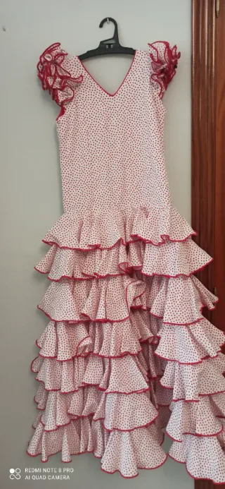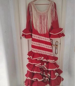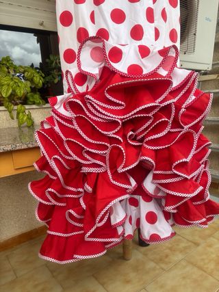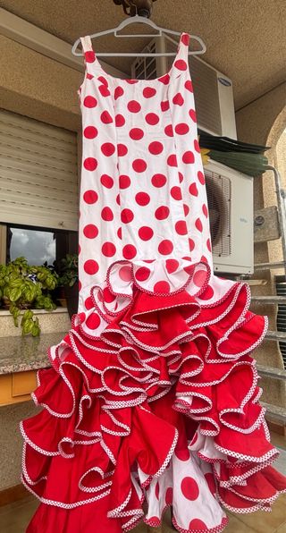 Es un traje de flamenca hecho a medida. Sería una talla 40-42, con posibilidad de ampliar a una talla más. • Color: rojo intenso con lunares blancos pequeños. • Corte: entallado hasta la cadera, realzando la figura, y a partir de ahí se abre con volantes en cascada. • En la falda, varios volantes superpuestos que aportan mucho movimiento y volumen. • En las mangas, volantes amplios a la altura del codo. En la enagua tiene un bolsillo para llevar todo lo necesario (llaves, monedero, barra labios…) Es un traje muy flamenco, femenino y tradicional, ideal para feria, El Rocío... con un aire clásico y elegante Costo mas de 400€