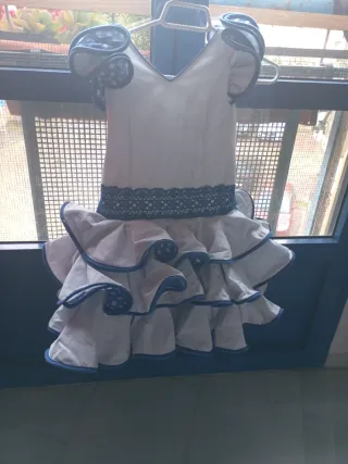 Precioso traje de flamenca para niña sirve para 3/4 anos mi hija en la foto tiene 4 ajos pero esta muy delgada tiene para soltarle un poco los volantes y echarle de largo - La blusa tiene un diseño de volantes. - La falda es de vuelo, con varias capas de vuelo. - Incluye detalles en rojo y blanco en la falda.