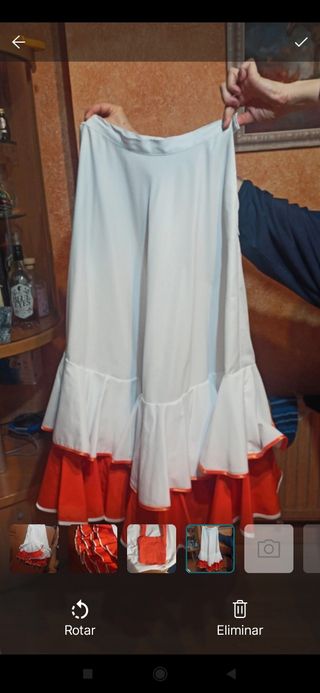 Falda de flamenca o para danza española, ideal para actuaciones. - Color rojo y blanco. - Mangas con volantes. - Detalle de ribete en las mangas.