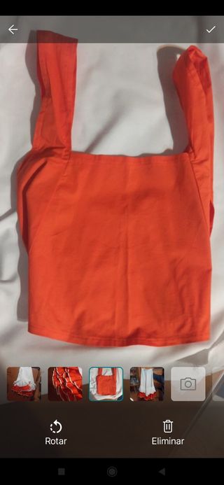 Falda y dos tops de flamenco para niña de entre 10 y 14 años. El top blanco de lunares rojos con volantes tiene un corchete descosido (mirar foto). La falda tiene mucho vuelo y los volantes en vez de ser redondos, son en pico. Falda: 90 cm de largo / 74 cm cintura Top rojo: 40 cm de espalda / 70 cm largo manga ara 2 Top de lunares: 40 cm de espalda