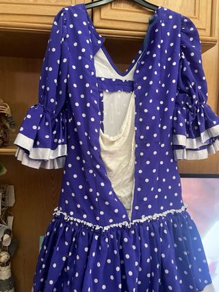 Vestido de flamenca con un diseño de lunares. - Mangas abullonadas. - Volantes en la falda. - Ribete azul. para niña de 7 a 9 años talla pecho 70 cm talla bajo 74 cm largo total 112 cm.
