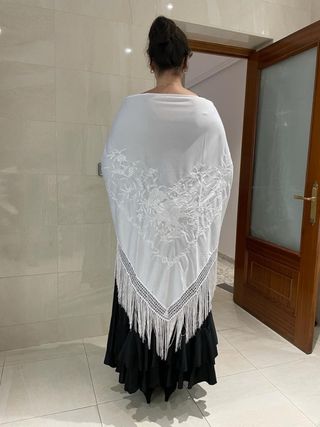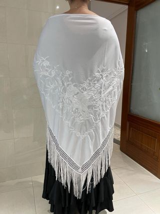 Elegante mantón de pico con un bonito bordado en blanco. 📐 Mide 1 metro de ancho y 2 metros de largo. - Tamaño XXL. - Diseño de pico. 🔴 Nuevo a estrenar 📦 Hago envios ➕ Hay más unidades Tags: mantillas, peinetas, broches, guantes de encaje, guantes de raso, peinecillos, mantilla, mantones de manila, flamenco, baile, faldas flamencas, patronales, procesión, semana santa, bodies, falda flamenca, mantón de manila, eventos, fiesta, abanicos, pericones, pericón, abanico de encaje, abanico de novia, abanico de madrina, academia de baile flamenco, castañuelas
