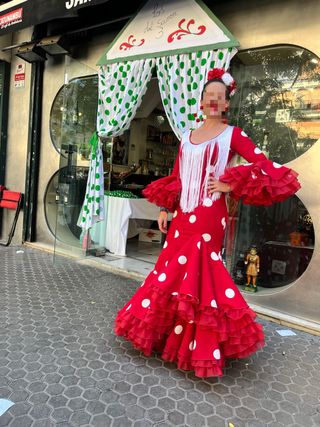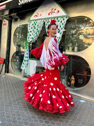 Precioso vestido de flamenca, ideal para cualquier evento. Es una prenda elegante y vistosa, perfecta para lucir en una feria o celebración. - Diseño de lunares rojos y blancos. - Mangas con volantes. - Falda con varias capas de volantes. - Detalle de flecos blancos en el pecho. Hecho en la tienda El Aljoli/ Huelva