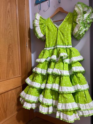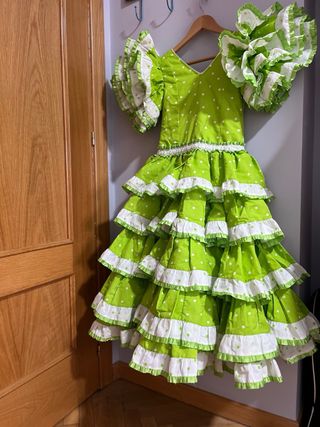 Vestido de flamenca para niña con un alegre diseño de lunares. Talla para niña 8 a 10 años aproximadamente. - Mangas con volantes. - Múltiples volantes en la falda. - Detalle de volantes blancos y verdes.
