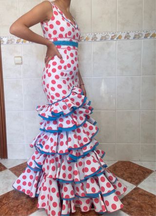 Precioso traje de flamenca hecho a mano para niña. Diseño con lunares turquesa sobre fondo blanco. Mangas acampanadas con volantes.Múltiples volantes en la falda. Calculo que puede ser para una niña de 8-9 años pero por favor comprobar las medidas : sisa 39 cm, cintura 35 cm, caderas 41 cm y largo 127 cm. Además en las costuras de los costados y del pecho tiene mucho para echar, de largo tiene menos como puedes comprobar en las fotos.