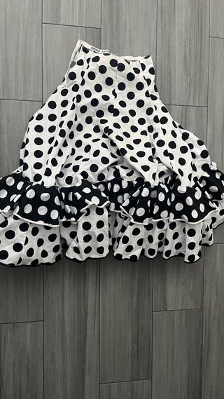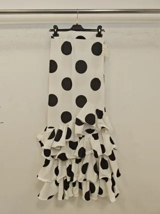 Falda de flamenca con estampado de lunares. - Diseño clásico en blanco y negro. - Volantes y detalles en el bajo. - Ideal para ensayos o actuaciones.