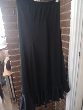 Falda larga de estilo flamenco, ideal para bailar - Diseño con amplios volantes en el bajo. - Cintura cómoda. - Tejido fluido que permite movimiento. Falda negra de ensayo talla M de punto con vuelo y un volante en el bajo cierre de cremallera medida cintura de unos 88 cm mas o menos . Y largo unos 90 cm. Se vende por 24 euros