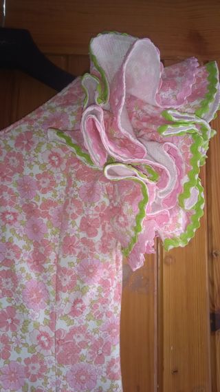 Vestido de flamenca con un estampado floral y detalles de volantes. - Diseño con estampado floral. - Volantes en mangas y falda. - Ribete en color verde en los volantes. Altura 120, sisa 40.cintur 35, cadera 45cm Beneficios íntegros para ayudar a personas sin hogar.