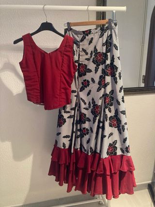 Conjunto de falda flamenca y maillot de manga larga. - Falda larga con volantes en el bajo.70 cm - Maillot de cuerpo entero con cuello redondo y manga larga.