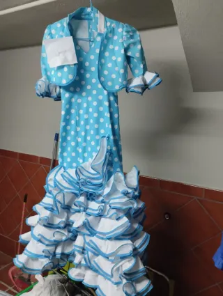 Traje de flamenca para niña con un alegre diseño de lunares. - Color azul con lunares blancos. - Incluye chaqueta a juego. - Volantes en la falda y mangas.no envío solo entregado en mano solo hablar por WhatsApp 699638451 negociable