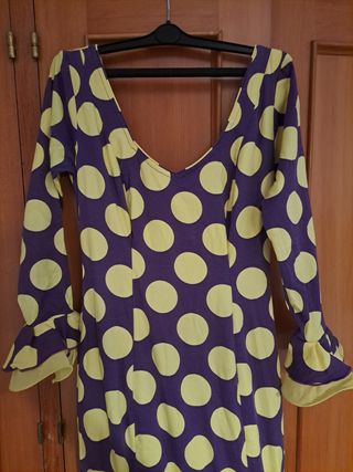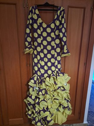 Vestido de flamenca morado con lunares grandes amarillos, el amarillo es más vivo de lo que se ve en las fotos. Falda levantada por el lado izquierdo. Escote delantero corazón y trasero cuadrado. Es sobre una talla 38 y tiene para sacarle unos 12cm con todas las costuras y 7cm de largo. De alto queda a ras de suelo para una persona de 1,65cm aproximadamente. Bolsillo grande en el interior de la falda. Se puede probar sin compromiso.